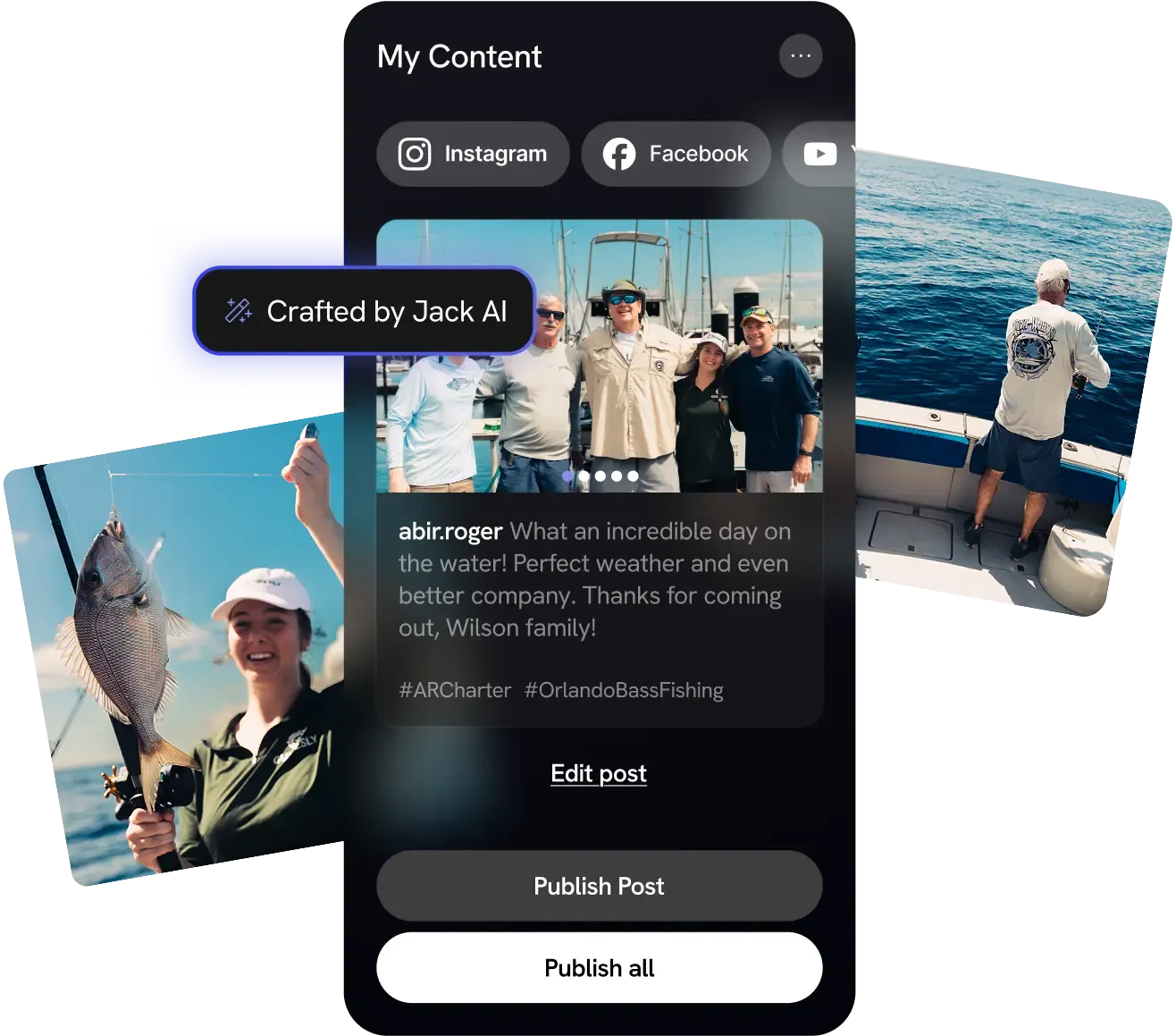 Jack creates posts and marketing emails for you using real trip data like GPS location, weather conditions, water temperatures, and your catch details. Everything is created in your voice ensuring authenticity.